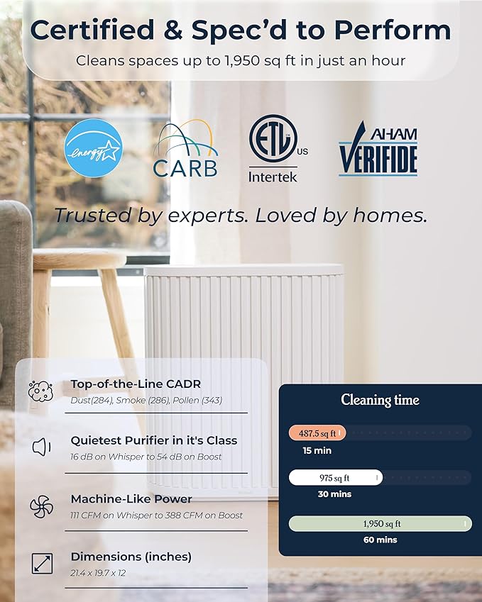 • EFFICIENT COVERAGE FOR YOUR HOME: Perfect for large rooms and open spaces, this air purifier cleans up to 1,950 sq. ft., making it ideal for all room types. With a CADR of up to 309, it can provide consistent and powerful air purification across large spaces.
