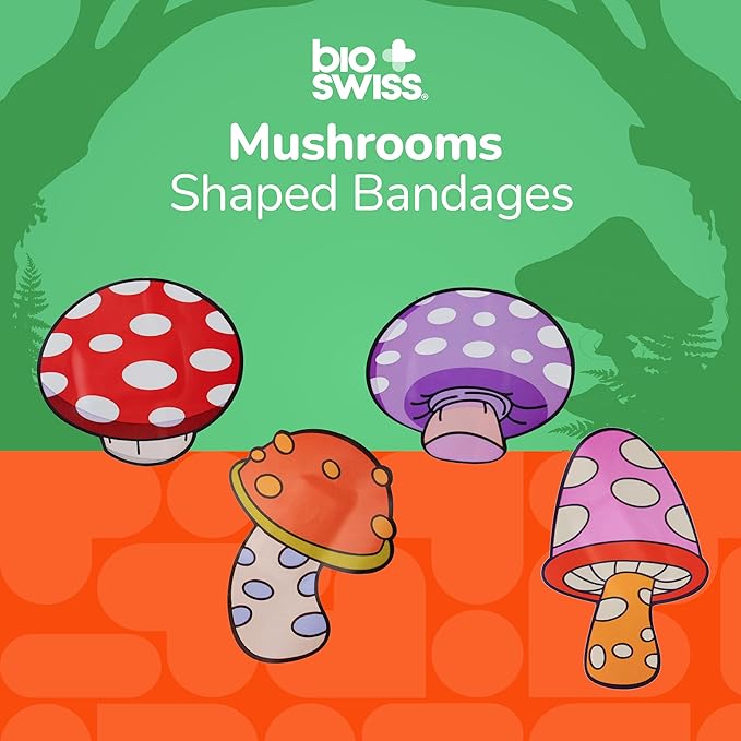 • MUSHROOM BANDAGES: This 24 piece pack of mushrooms shaped bandages features 4 fun mushroom shapes, and is great for putting a smile on kids' faces while protecting wounds such as cuts, scrapes, and burns; sticky bandages come in a cute cardboard box and are perfect for kids and adults alike, and also for school nurses and pediatric doctors