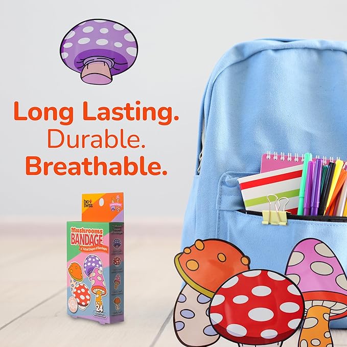 • EASY TO CARRY AND USE: These cute and colorful Mushroom children's bandages are easy to take with you for travel, and easy to store in a home first aid kit; these healing bandages are perfect for school, summer camp, camping trips, weekend getaways and more
