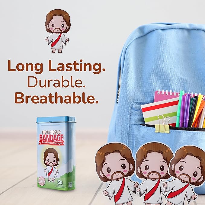 • HOLY JESUS BANDAGES: This 50 piece tin of Jesus shaped bandages is great for putting a smile on kids' faces while protecting wounds such as cuts, scrapes, and burns; sticky bandages come in a cute tin and are perfect for kids and adults alike, and also for school nurses and pediatric doctors