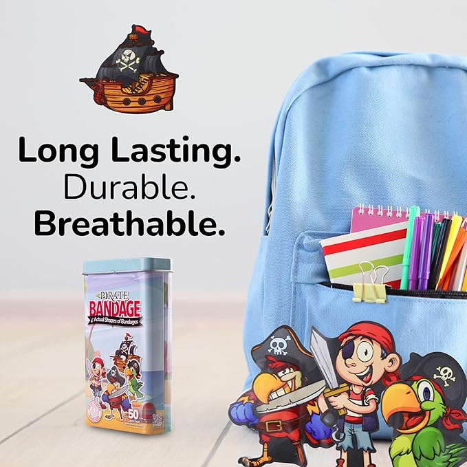 • PIRATES BANDAGES: This 50 piece tin of pirate shaped bandages features 4 fun pirate, parrot, and pirate ship shapes, and is great for putting a smile on kids' faces while protecting wounds such as cuts, scrapes, and burns; sticky bandages come in a cute tin and are perfect for kids and adults alike, and also for school nurses and pediatric doctors