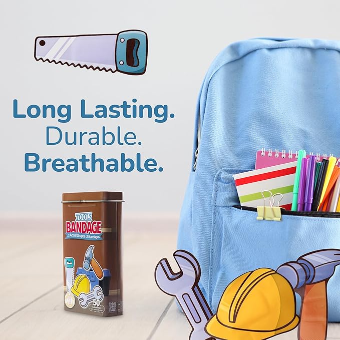 • TOOLS BANDAGES: This 50 piece tin of tool shaped bandages features 4 fun tool shapes (hard hat, saw, wrench, and hammer), and is great for putting a smile on kids' faces while protecting wounds such as cuts, scrapes, and burns; sticky bandages come in a cute tin and are perfect for kids and adults alike, and also for school nurses and pediatric doctors