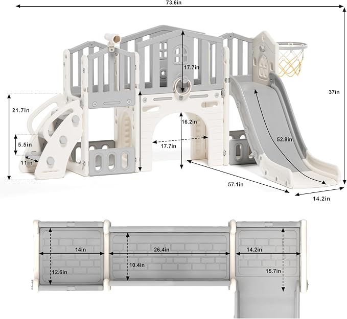• Perfect Gift: If you're looking for a gift for children, this multifunctional play set is your best choice. Kids can climb the ladder, balance on the castle-themed corridor, slide down the slide, crawl through the tunnel, and shoot balls into the basketball hoop.