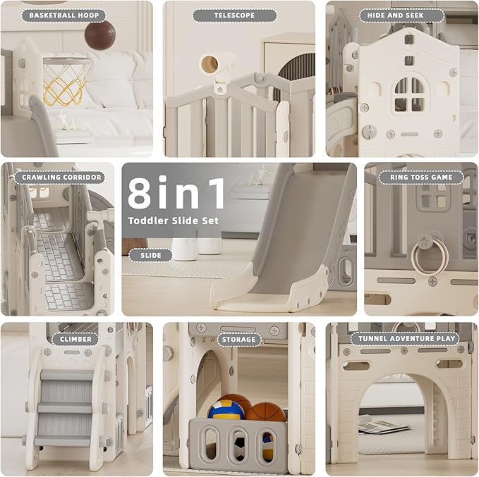 • Educational Toddler Slide Set: Suitable for ages 0-3! Our toddler slide set includes a slide, an arch, a storage compartment, a basketball hoop, a telescope, a three-tiered staircase, and a corridor.