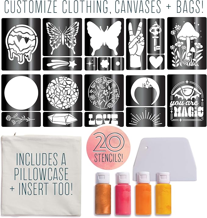 • Complete DIY Kit – Includes 4 vibrant fabric paints (including metallic bronze), 20 reusable stencils, squeegee, tape, and even a pillow and pillowcase to kickstart your creations!