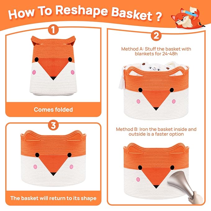 • 【Note】The baby blanket baskets arrive folded, but please don’t worry—this is not a quality issue. You can check out the videos we uploaded. Fill it with blankets and quilt in 24 to 48 hours to make it look round. Then iron the creased places inside and outside the basket. It'll get back to its best shape. This is a basket you’ll use for years. We’ve put a lot of care and love into designing these baskets, and you can trust the quality and craftsmanship.