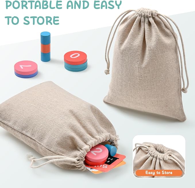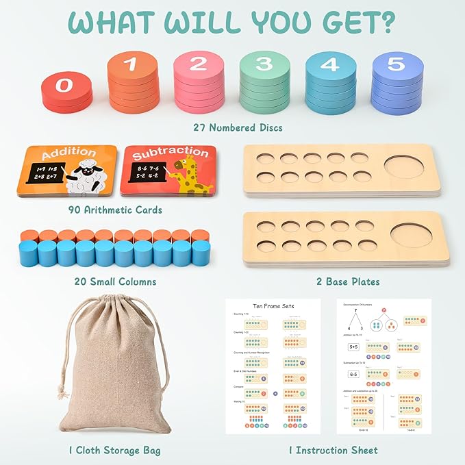 • 1 to 20 Montessori Math Toys: Our ten frame set comes with a rich variety of accessories. It includes two Ten Frame boards, two sets of number discs ranging from 0 to 10, one set of wooden pegs, one set of arithmetic symbols, 90+ addition and subtraction flashcards, and a storage bag. These accessories can teach toddlers mathematics in a progressive manner, helping them understand and learn addition and subtraction of numbers from 1 to 20. It is suitable for use at home or in the classroom