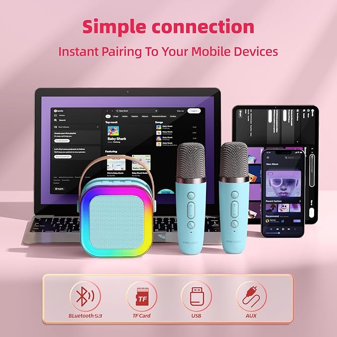 • Premium Sound with 2 Wireless Microphones. Unlike low-cost karaoke machines with distorted audio, Kinglucky delivers clear, immersive sound with deep bass. Adjustable volume lets parents set a safe level so kids can sing freely without disturbing the household