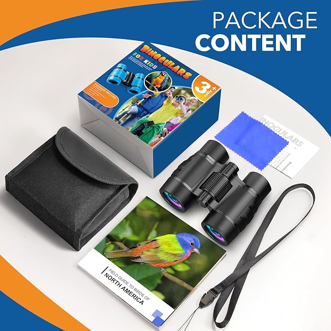 • Adventure Accessories: This fun binoculars is a perfect tool for your kid's outdoor adventure! Package Includs 1x 4x30 Binoculars, 1x Bird Watching Manual, 1x Carrying Canvas Bag, 1x Neck Strap, 1x Lens Wiping Cloth