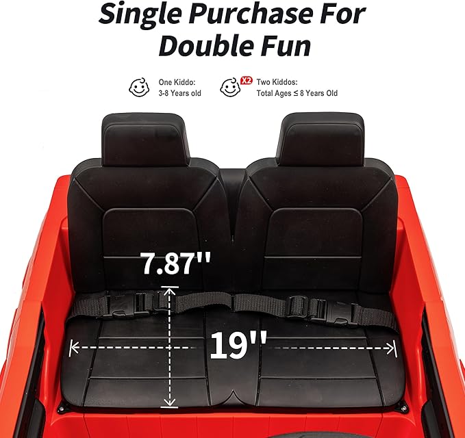 • 19" WIDE TWO SEATER: This 24V battery powered police kids car has ample seater, allowing two children to ride together comfortably under 110lbs. Adjustable seat belts and double-locking door design also ensure kid's safety.