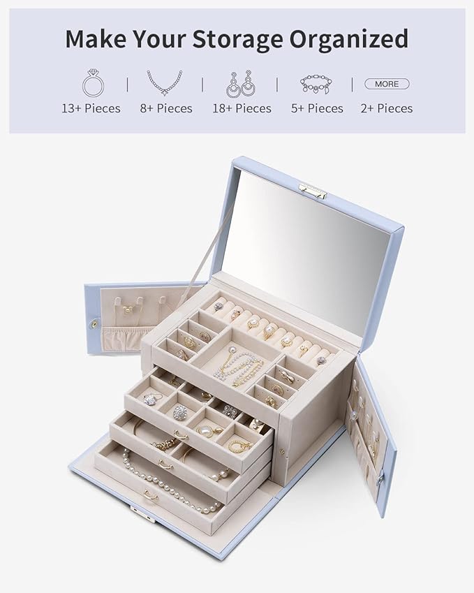 • [Spacious & Multifunctional] This large jewelry box has 4 layers. The first layer has a row of ring slots, 6 earring boards, and a large grid for bracelets. The second layer has 12 small grids for storing earrings and brooches. The third layer has 4 large grids for bracelets and bangles. The fourth layer is for larger necklaces. Additionally, there are 8 necklace hooks on both sides of the jewelry box, and the hook design prevents necklaces from tangling with each other.