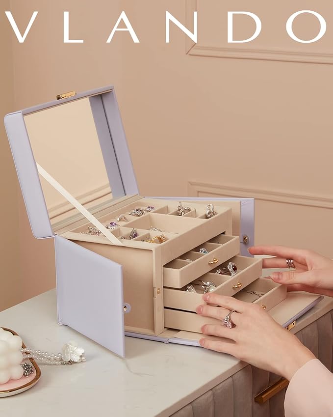 Vlando Jewelry Box for Girls, 4-Tier Jewelry Organizer with Lock, Mirror Jewelry Box for Earring, Ring, Necklace and Bracelets - Purple