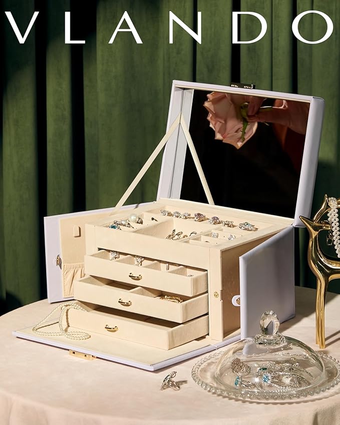 • [Soft Material & Mirror] The exquisite and glossy leather material gives the jewelry box a more premium appearance, while the soft velvet interior provides better protection for your jewelry. This jewelry box also comes with a mirror, making it convenient for makeup needs when you're on the go.