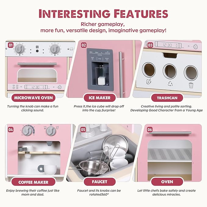 • 🎁Safety And Durability Guaranteed: Our wooden toy kitchen set is made of high-quality, child-safe materials and meets US ASTM F963 and CPSIA standards, ensuring a safe and durable play experience for your children. Our kitchen toy set adds an anti-tip design to ensure that the product will not tip over, protecting your child's safety at all times!