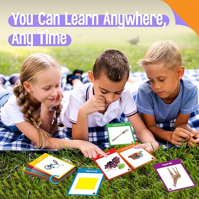 • 60 Double-sided Bilingual Cards: It comes with 60 word cards and 2 plastic rings. Each card features English on one side and Spanish on the other, allowing children to learn vocabulary in two languages. It measures 4.7" x 3.2", compact enough for little hands while providing ample space for clear and legible words and illustrations.