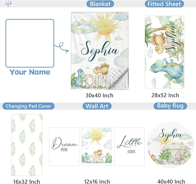 Personalized Baby Crib Bedding Set, 5 Pcs Custom Set With Name, Soft Double Layer Nursery Bedding, Flannel Dinosaur Set for Boys, Toddlers Newborns Customized Gift