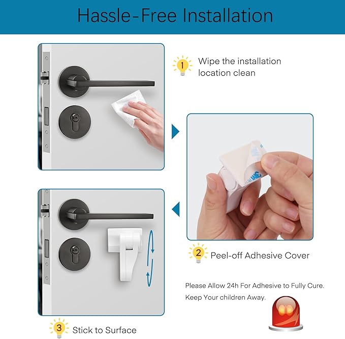• Easy to Install and Remove: No need tools. Peel the damage-free 3M adhesive and place the Baby Safety Door Handle Lock on the door. Use hair dryer will help you remove the lock without any residue