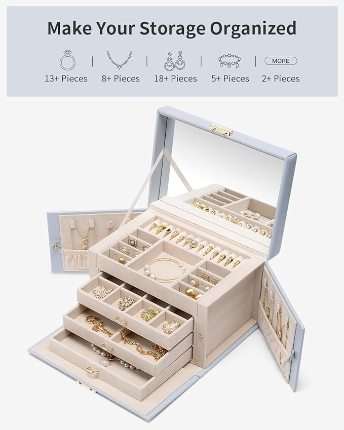 • [Spacious & Multifunctional] This large jewelry box has 4 layers. The first layer has a row of ring slots, 6 earring boards, and a large grid for bracelets. The second layer has 12 small grids for storing earrings and brooches. The third layer has 4 large grids for bracelets and bangles. The fourth layer is for larger necklaces. Additionally, there are 8 necklace hooks on both sides of the jewelry box, and the hook design prevents necklaces from tangling with each other.