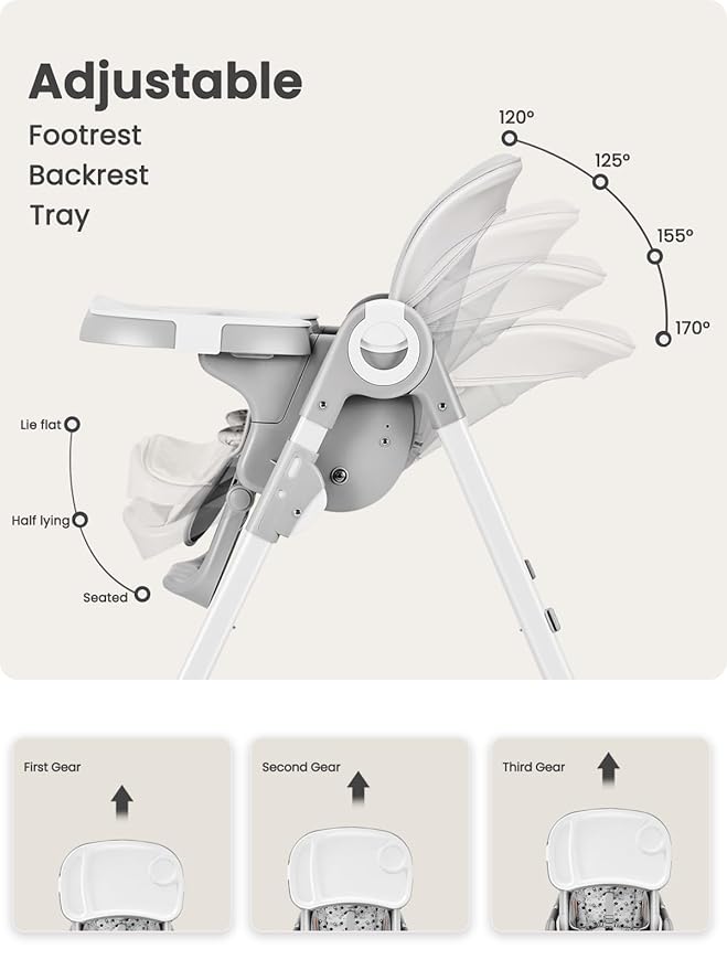 • Fully Adjustable Design: Customize for your baby's comfort with a 3 level footrest, 4 position reclinable backrest, and 3 position adjustable tray. Both the tray and footrest adapt as your child grows.