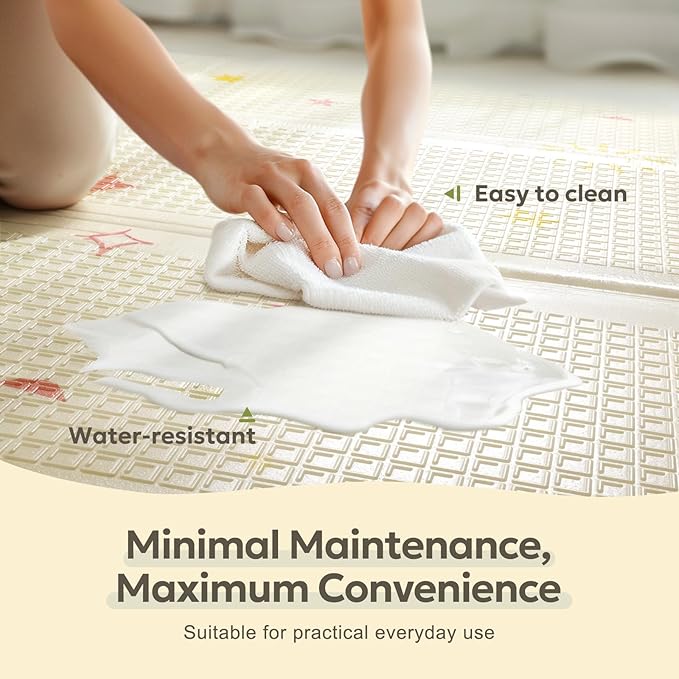 • EASY TO CLEAN & FOLD: Enjoy effortless clean-ups with our waterproof foam play mat that resists spills and stains. A simple wipe with a damp cloth or towel keeps it pristine and ready for play. Its foldable design allows you to quickly fold it into a compact size, while the handy carry bag ensures easy storage and portability, making it ideal for on-the-go families