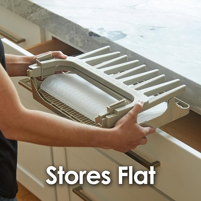 • ✅ BEAUTIFUL SPACE SAVING DESIGN: Great for air drying everyday items like plastic bags, cups, baby bottles, tumblers and most items which are not dishwasher safe. The compact drying rack sits near the back of your counter, leaving the front counter area available for use. The silicone drying mat keeps moisture off of your counter–the clear frosted mat works with ALL countertop colors and folds in half for easy storage.