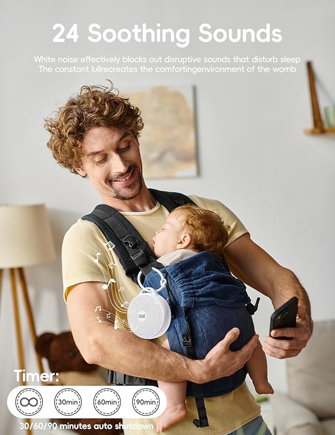 • The Best Sleep Sound Machine Designed For Baby and Parents: Baby Sound Machine designed for all things sleep, this white noise machine comes with favorable features: warm night light and colored light, 24 soothing sounds, recording function, customized timers, various volume levels, rechargeable battery, child-lock for safety, and even memory functions! This sound machine is effectively blocks out disruptive noises, making it easier for your baby and you to sleep undisturbed wherever you are.