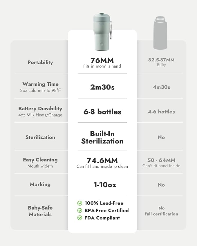 • Built-in Sterilizer & Safe Materials: The world's FIRST portable milk warmer with built-in sterilizer, helps maintain hygiene without extra tools. The warming chamber is made of FDA-compliant food-grade stainless steel — safe for breastmilk/ formula.