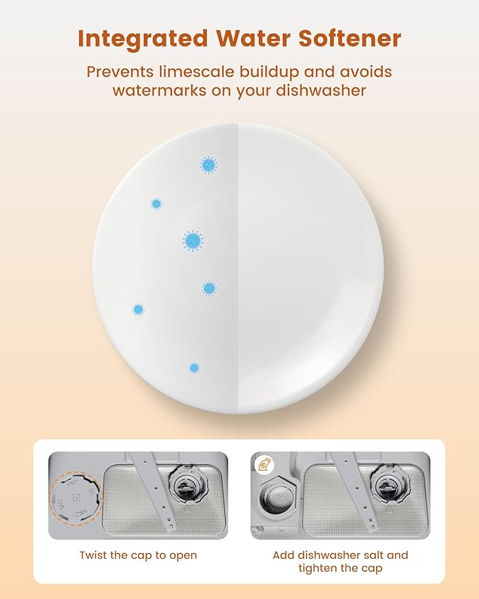 • Integrated Water Softener - The HAVA Portable Dishwasher is now equipped with a water softener that effectively deals with hard water problems. Choose the softener setting based on your water hardness to prevent limescale buildup inside the machine and avoids watermarks on your dishware, to ensure optimal cleaning results.