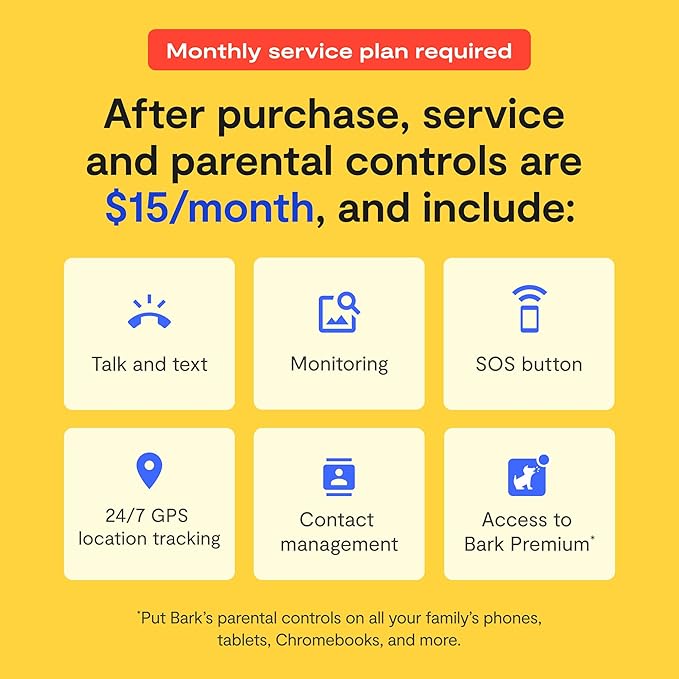 • ACTIVATION REQUIRED: After purchase, users will pay $15/month for service and parental controls. The Bark Watch has its own phone number.