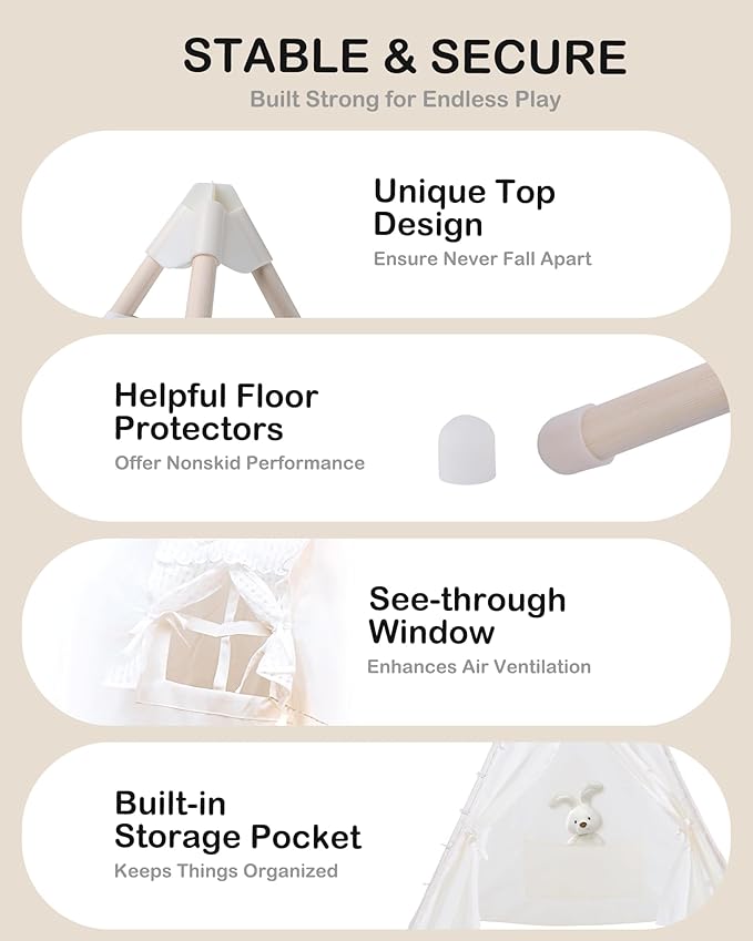 • More stability & Security: More stable thanks to the unique top wood stick fixing structure-teepee stabilizer and rubber stoppers on the legs, that helps it from sliding, without the risk of folding or collapsing. Kids tent window for good air circulation and play hide and seek with kids.