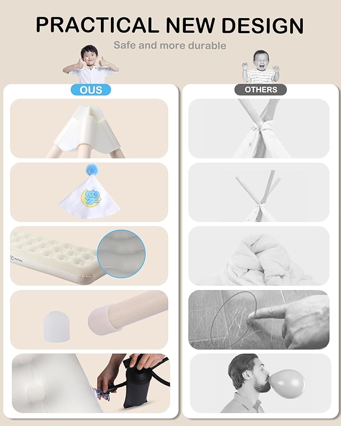 • Product Details: The package you receive will include 1 washable cotton canvas kid teepee tent (65''*51''*71''), 1 inflatable mattresses (73.2''* 30''* 8.7''), a bright star light strings (118"), 16 detachable plastic sticks, 12 plastic stick connectors, 1 manual inflation pump, 4 non-slip bottom rubber caps, 5 different balloons , 1 top stabilizers and 1 topside cute cap.