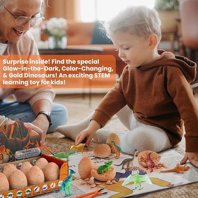 • 1.Uncover 12 Unique Dinosaur Models: Imagine being a real paleontologist! Excavate 12 dino eggs to discover unique toy dinosaurs, including 3 Special Surprise Dinosaurs, one Glow-in-the-Dark Dinosaur, one Color-Changing Dinosaur and one Golden Dinosaur.