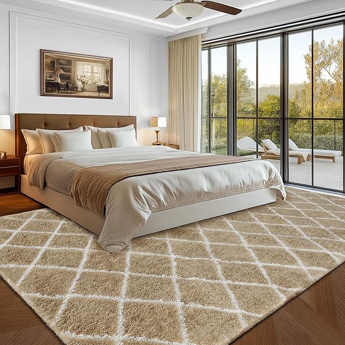 Fluffy Rug for Bedroom, Stripe Checkered Rug Anti-Skid High Pile for Living Room Bedroom Kids Room Nursery, Dorm Home Decor