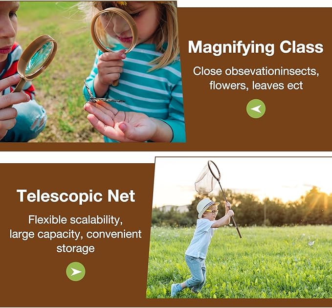 • 【All-in-One Adventure Kit】 This comprehensive set includes a magnifying glass for close-up observations, an extendable net, tweezers, a grabber, a cage, a container, cards, and a portable bag. It has everything kids need to dive into exciting outdoor adventures.