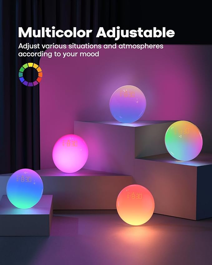 • White Noise Sound Machine for Sleep: Enjoy better sleep with the built-in white noise and calming sunset simulation. This alarm clock for heavy sleepers in bedrooms helps both adults and kids fall asleep faster and stay asleep longer.