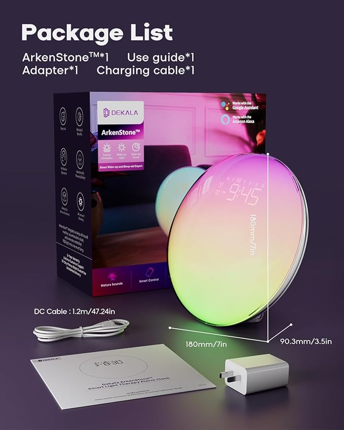 • Sunrise Alarm Clock Wake Up Light: DEKALA smart alarm clock combines a sunlight alarm clock with a radio alarm clock and sound machine. Features 11 dynamic scene lights and 15 soothing natural sounds to gently wake you up, ideal for bedrooms and kids alarm clock needs.