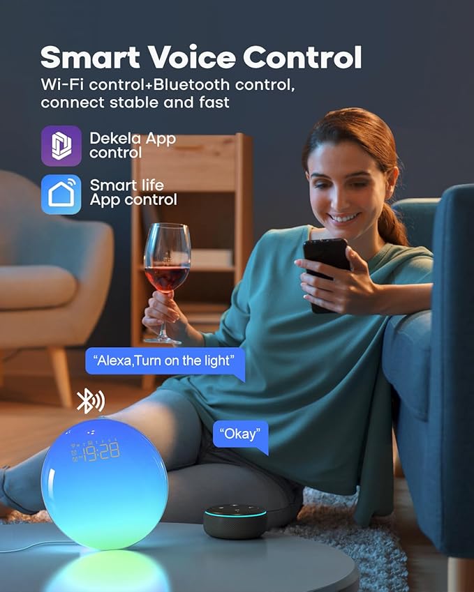 • Voice Control & App Control: The smart alarm clock wake up light supports Alexa voice commands and can be controlled via DEKALA and Smart Life Apps. Adjust the light alarm clock sunrise brightness and sounds remotely for a personalized wake-up experience.