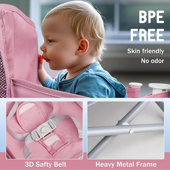 • CERTIFIED SAFETY FOR YOUR LITTLE ONE: The portable baby chair is rigorously tested and certified, meeting strict US safety standards. Passed US safety requirments of sharp points, heavy metals, or small parts testings etc, it’s designed to protect your child from harm. Plus, it’s BPA, Phthalates, and AZO-free, 3-point safety harness, ensuring a safe and healthy space for every meal.