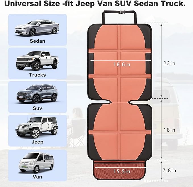 • The whole dimension of the auto seat protector carseat is 17.9 x 46.45 inch, the seat:17.9 x 16.9 inch, the back: 17.9 x 21.6 inch, and the mesh pocket: 12.9 x 6.8 inch. Universal fit Jeep Van SUV Truck.