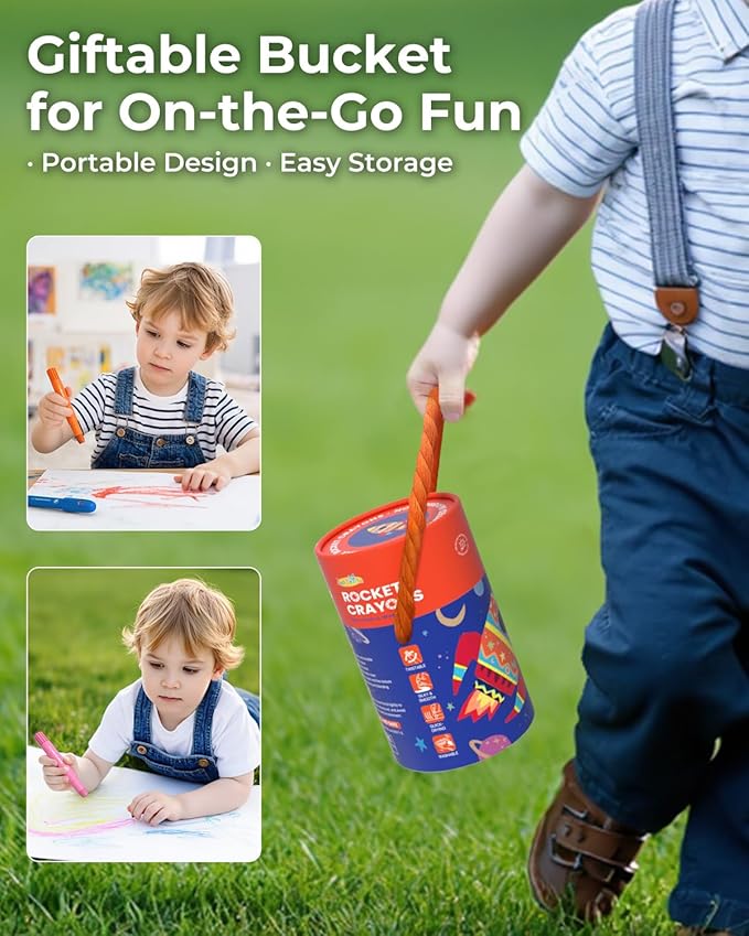 • Spark Little Imaginations with Rocket Crayons: The unique rocket-shaped design sparks children’s interest in space and science. It’s a fun way for parents and grandparents to start engaging, space-themed conversations while drawing together. Our twist crayons encourage early STEM curiosity and make learning more exciting through creative play