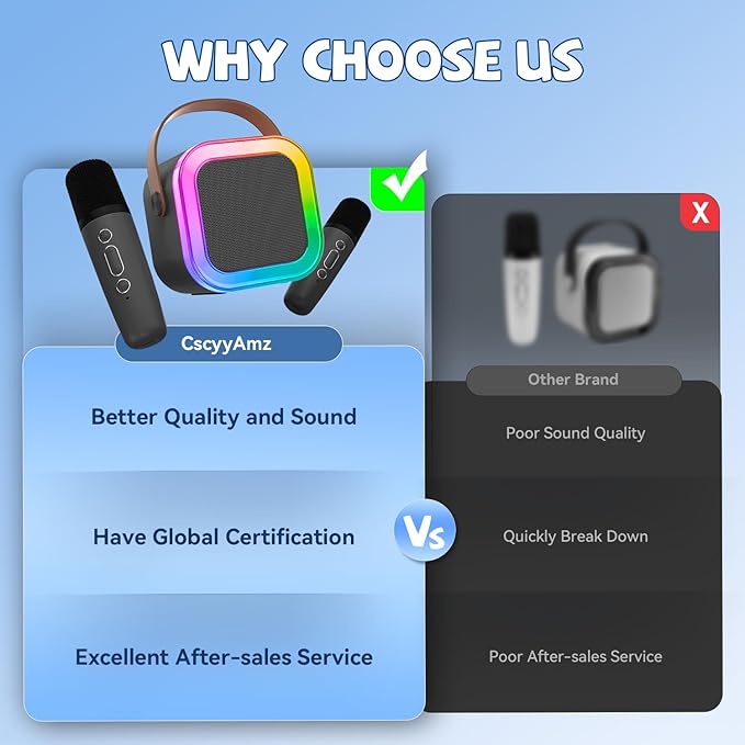 • 【Take the Party Anywhere】10H Playback(USB-C rechargeable) beats 90% of mini karaoke machines.Small and light design is convenient for you to take anywhere.And you can safely let your children play mini karaoke machine by themselves(meets toy safety standards).We promise provide replacement for any product damage within 5 years.