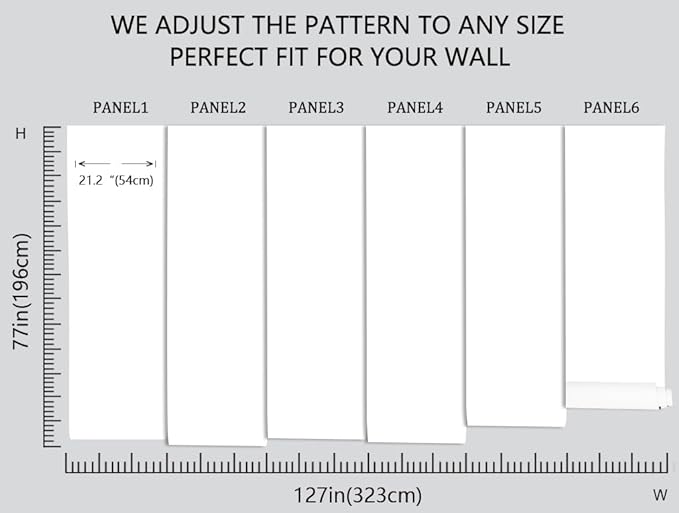 • Before purchasing, you need to measure the size you need, our mural is 77 inches high and 127 inches wide, in order to facilitate long-distance transportation, we divide the width of the mural into six pieces of 21.2 inches each, with a numerical serial number underneath each piece for easy installation!
