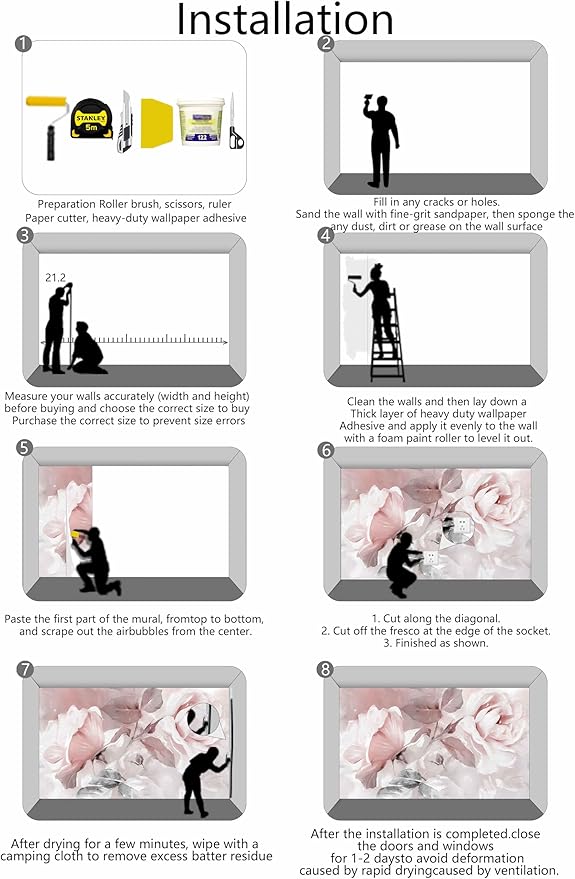 • Installation Steps1. Fill in any cracks or holes and clean the surface of the wall of dust, dirt and grease.2. Apply heavy-duty wallpaper paste to the wall, not the mural.3. Mark the position of each strip of wallpaper with a spirit level.4. Align the pattern and slide it into place.5. Scrape the bubbles with a spatula.6. Let it dry for a couple of minutes and it's ready to go!