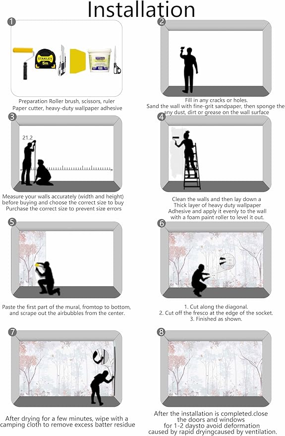 • Installation Steps1. Fill in any cracks or holes and clean the surface of the wall of dust, dirt and grease.2. Apply heavy-duty wallpaper paste to the wall, not the mural.3. Mark the position of each strip of wallpaper with a spirit level.4. Align the pattern and slide it into place.5. Scrape the bubbles with a spatula.6. Let it dry for a couple of minutes and it's ready to go!