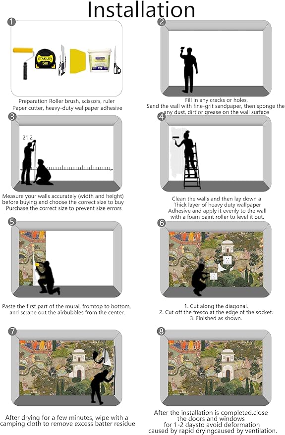 • Installation Steps1. Fill in any cracks or holes and clean the surface of the wall of dust, dirt and grease.2. Apply heavy-duty wallpaper paste to the wall, not the mural.3. Mark the position of each strip of wallpaper with a spirit level.4. Align the pattern and slide it into place.5. Scrape the bubbles with a spatula.6. Let it dry for a couple of minutes and it's ready to go!
