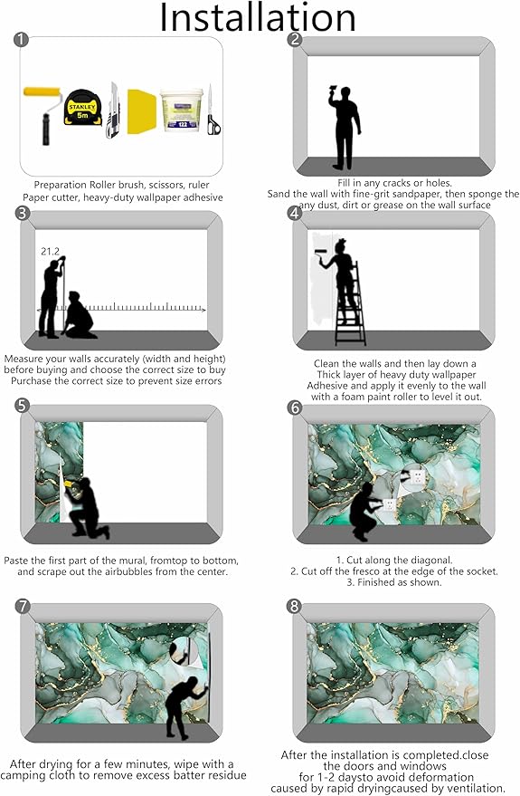 • Installation Steps1. Fill in any cracks or holes and clean the surface of the wall of dust, dirt and grease.2. Apply heavy-duty wallpaper paste to the wall, not the mural.3. Mark the position of each strip of wallpaper with a spirit level.4. Align the pattern and slide it into place.5. Scrape the bubbles with a spatula.6. Let it dry for a couple of minutes and it's ready to go!