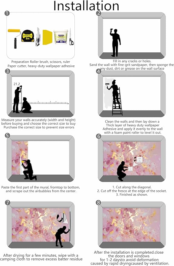 • Installation Steps1. Fill in any cracks or holes and clean the surface of the wall of dust, dirt and grease.2. Apply heavy-duty wallpaper paste to the wall, not the mural.3. Mark the position of each strip of wallpaper with a spirit level.4. Align the pattern and slide it into place.5. Scrape the bubbles with a spatula.6. Let it dry for a couple of minutes and it's ready to go!