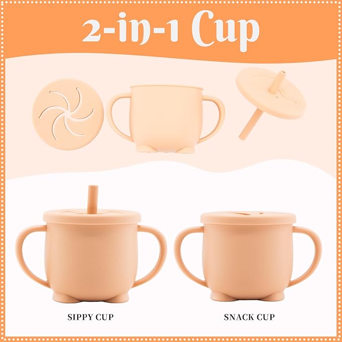 • Baby Led Weaning Supplies: Our silicone bib is designed with a deeper and sturdier pocket, making it highly effective in catching dropped food and easy to clean. The adjustable circular design is particularly gentle on your baby's skin. Our training cup is expertly crafted to fit snugly in your baby's small hands and mouth, safeguarding their developing teeth. Furthermore, the straw is equipped with a spill-proof function, aiding babies in transitioning from breastfeeding and promoting independent drinking.