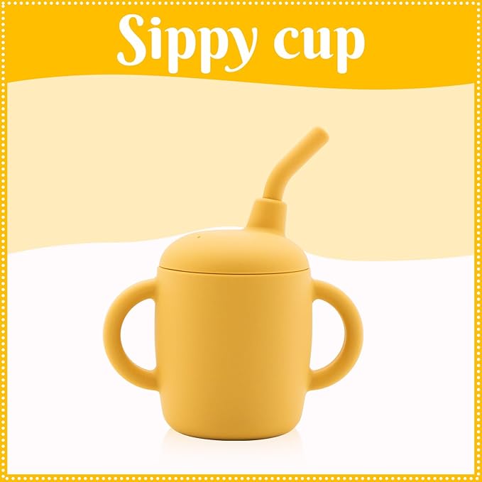 • Baby Led Weaning Supplies: Our silicone bib is designed with a deeper and sturdier pocket, making it highly effective in catching dropped food and easy to clean. The adjustable circular design is particularly gentle on your baby's skin. Our training cup is expertly crafted to fit snugly in your baby's small hands and mouth, safeguarding their developing teeth. Furthermore, the straw is equipped with a spill-proof function, aiding babies in transitioning from breastfeeding and promoting independent drinking.