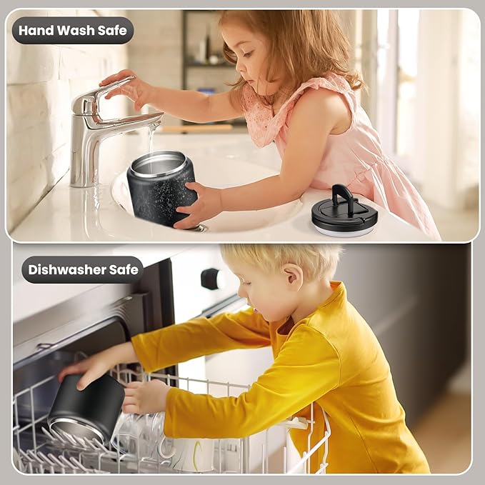 • Leak Proof Design: The compression vacuum design with seal washer guarantees 100% leak-proof, the hidden handle and hidden folding spoon are designed for easy opening and carrying. Don't worry about it spilling out and messing up kids lunch bag.
